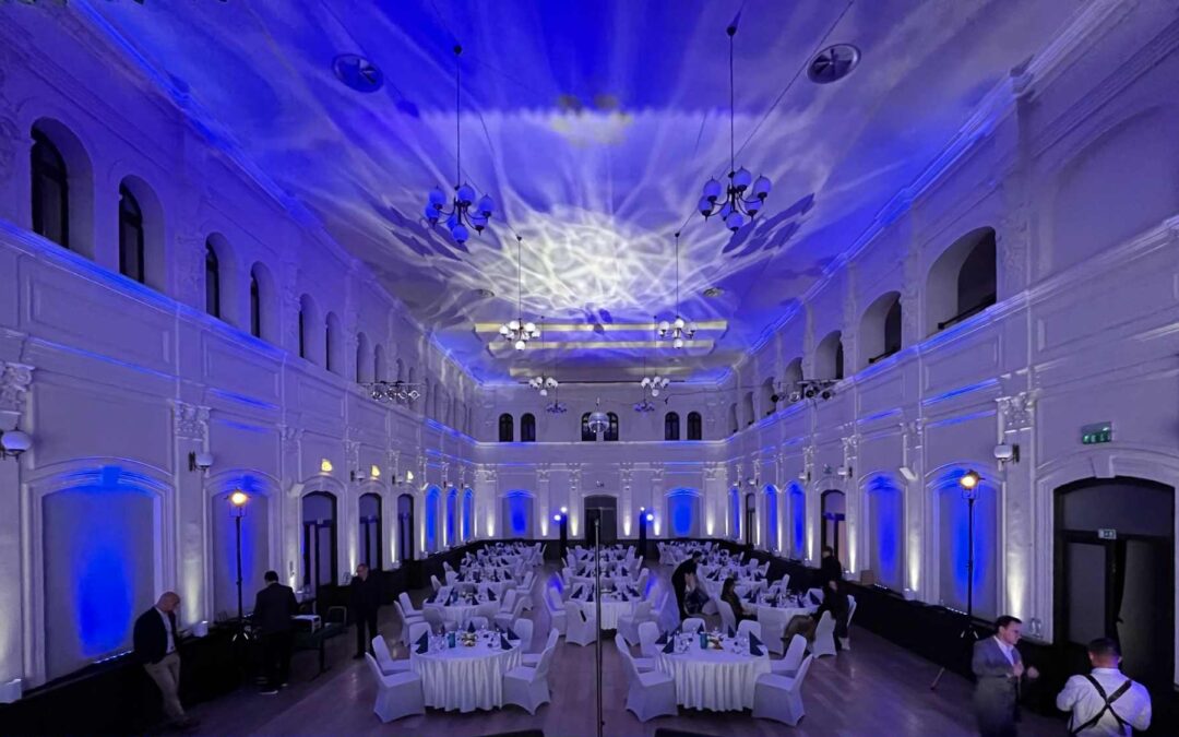 A fénytechnikai munkában segítve a beltéri és kültéri világítási megoldások összehangolásán dolgoztam, beleértve a gyulai Vigadó épületének külső fénydekorációját is. A rendezvény arculatához igazodva a kék és fehér színek domináltak, de fontos elvárás volt, hogy az összkép ne legyen hideg vagy rideg – inkább modern, elegáns, mégis barátságos hangulatot sugározzon. Ennek eléréséhez több mint 60 lámpa összehangolt használatára volt szükség.